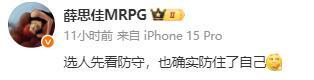 郭士強就喜歡選能防守的隊員,高鐵(高詩巖)入選國家隊,被眾人稱是防守尖兵,能為郭士強賣命。李祥波、雷蒙、朱俊龍也是冠為防守悍將,但兩戰(zhàn)韓國什么也不是,首戰(zhàn)李、雷兩人共坐了80分鐘,昨晚王嵐嵚也坐了40分鐘,叫這些人來都不上場,作用何在?是不是可以選能進攻的隊員來。李弘權(quán)、王浩然、徐杰、王睿澤這些在全運會打得風生水起的射手,被郭士強忽略了。上海跟隊記者薛思佳嘲諷郭士強:選人先看防守,也確實防住了自己。
