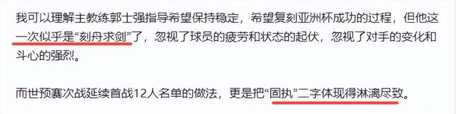 名嘴蘇群怒批郭士強固執(zhí),不懂得調(diào)整和變通,“同一張卷子,第一遍做的一塌糊涂,結(jié)果第二遍更加一塌糊涂,這確實沒想到的,而且第一遍做得文不對題,第二遍用同樣的方式繼續(xù)文不對題,思路沒有極端調(diào)整,確實不可思議,匪夷所思,沒法理喻”。麥穗豐噴道:世預賽次戰(zhàn)延續(xù)首戰(zhàn)12人名單的做法,更是把“固執(zhí)”二字體現(xiàn)得淋漓盡致。
