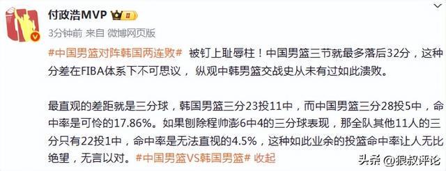 媒體人“付政浩”發(fā)文點(diǎn)評(píng):被釘上恥辱柱!中國(guó)男籃三節(jié)就最多落后32分,這種分差在FIBA體系下不可思議, 縱觀中韓男籃交戰(zhàn)史從未有過如此潰敗。