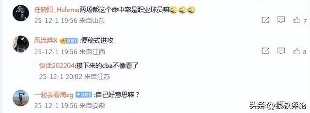 網(wǎng)友:“任曉陽(yáng)_Helena”點(diǎn)評(píng):兩場(chǎng)都這個(gè)命中率是職業(yè)球員嘛?